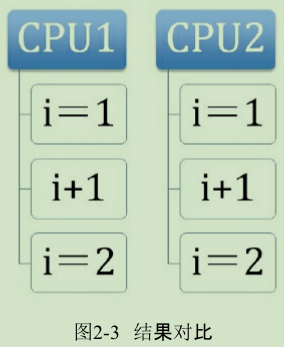 第一个机制是通过总线锁保证原子性。如果多个处理器同时对共享变量进行读改写操作(i++就是经典的读改写操作),那么共享变量就会被多个处理器同时进行操作,这样读改写操作就不是原子的,操作完之后共享变量的值会和期望的不一致。举个例子,如果i=1,我们进行两次i++操作,我们期望的结果是3,但是有可能结果是2,如图2-3所示。