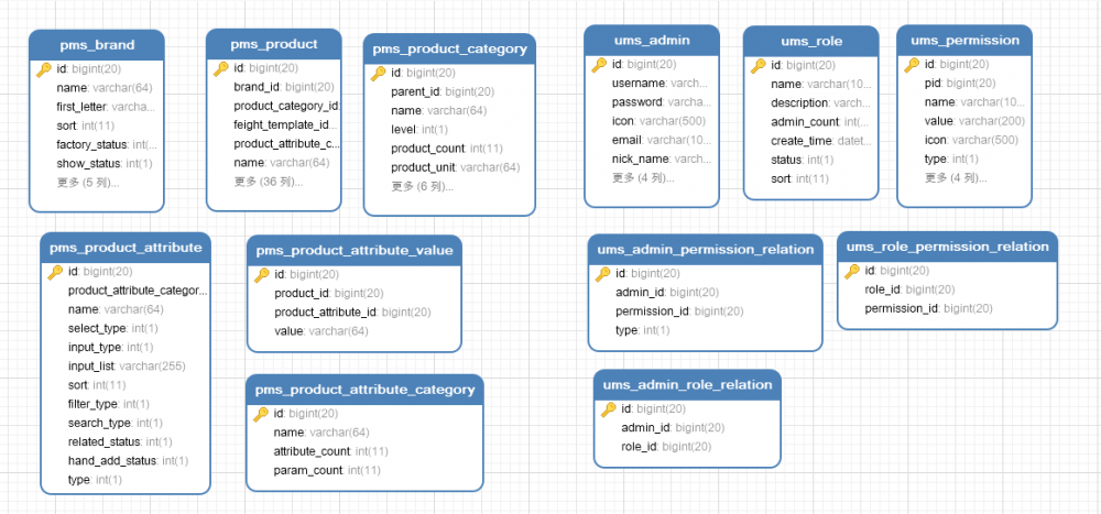 CREATE TABLE `pms_brand` ( `id` bigint(20) NOT NULL AUTO_INCREMENT, `name` varchar(64) DEFAULT NULL, `first_letter` varchar(8) DEFAULT NULL COMMENT '首字母', `sort` int(11) DEFAULT NULL, `factory_status` int(1) DEFAULT NULL COMMENT '是否为品牌制造商:0->不是;1->是', `show_status` int(1) DEFAULT NULL, `product_count` int(11) DEFAULT NULL COMMENT '产品数量', `product_comment_count` int(11) DEFAULT NULL COMMENT '产品评论数量', `logo` varchar(255) DEFAULT NULL COMMENT '品牌logo', `big_pic` varchar(255) DEFAULT NULL COMMENT '专区大图', `brand_story` text COMMENT '品牌故事', PRIMARY KEY (`id`) ) ENGINE=InnoDB AUTO_INCREMENT=59 DEFAULT CHARSET=utf8 COMMENT='品牌表'; 复制代码