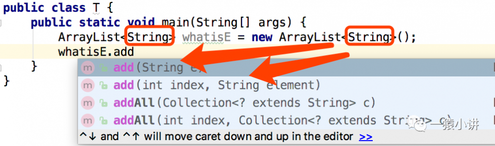 发现编译器会把 E 被真正的类型所取代,其实也就是当我们创建出 ArrayList<String>,那么对应的 add() 会变成 add(String e);当我们创建出 ArrayList<Dog>,那么对应的 add() 会变成 add(Dog e)。