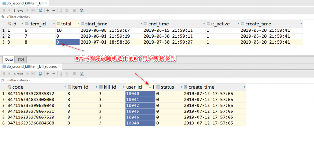 即库存为6本的商品~书籍恰好被10个用户中的6个秒杀得到!这种结果其实对于我们、对于用户来讲肯定是皆大欢喜的结局!