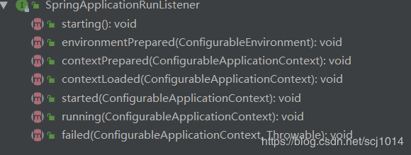 SpringApplicationRunListener 接口中共有上面几个方法,这几个方法将会贯穿run()方法的运行。