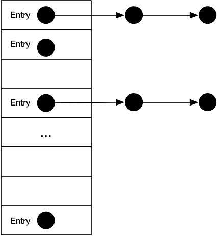 与 HashMap 类似, Hashtable 也是散列表的实现。它的内部结构可以理解为 「数组 + 链表」的形式,结构示意图如下: