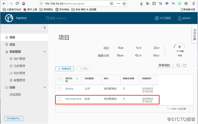 然后开始将我们构建好的镜像推送到我们的镜像仓库,这里我用的是Harbor,安装步骤这里不演示了