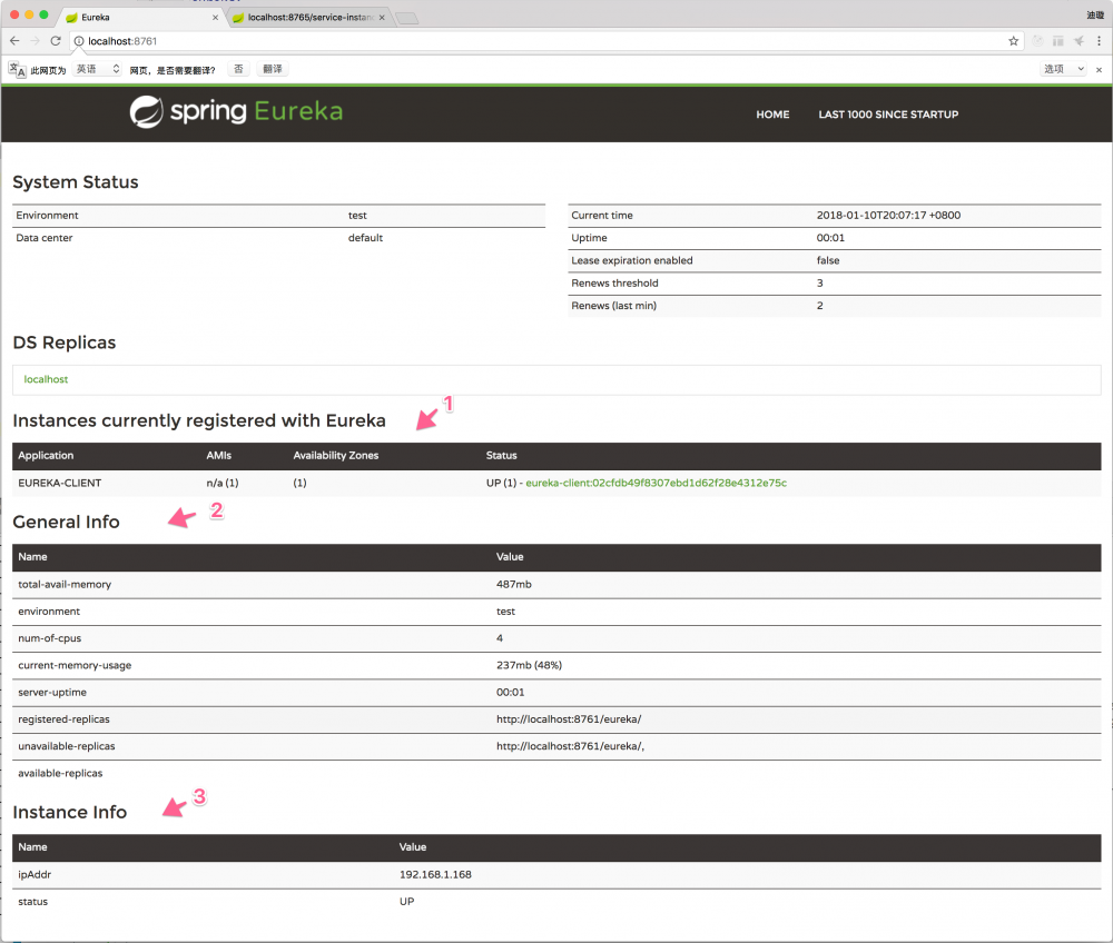 搭建好上述的两个的Eureka应用后,依次启动Server和Client。