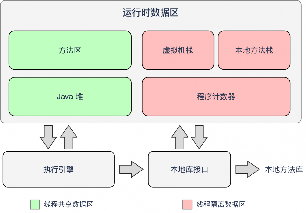 Java 虚拟机在执行 Java 程序的过程中会把它所管理的内存区域划分为若干个不同的数据区域。这些区域都有各自的用途,以及创建和销毁的时间,有些区域随着虚拟机进程的启动而存在,有些区域则是依赖线程的启动和结束而建立和销毁。Java 虚拟机所管理的内存被划分为如下几个区域:
