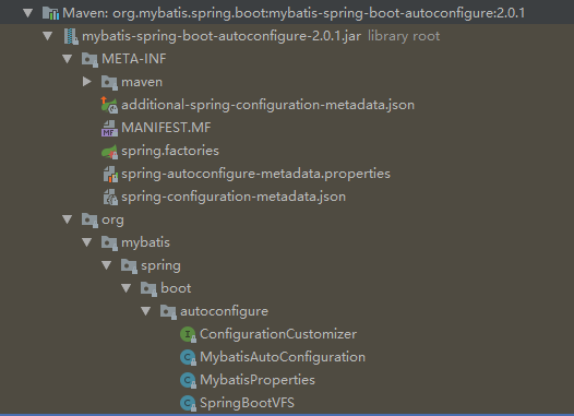 这里简单说一下流程,有兴趣的可以看下这个类的源码。SpringFactoriesLoader会扫描classpath下的所有jar包,并加载META-INF/spring.factories下的内容。我们以mybatis-spring-boot-starter为例,里面有个依赖mybatis-spring-boot-autoconfigure,可以看到存在META-INF/spring.factories。