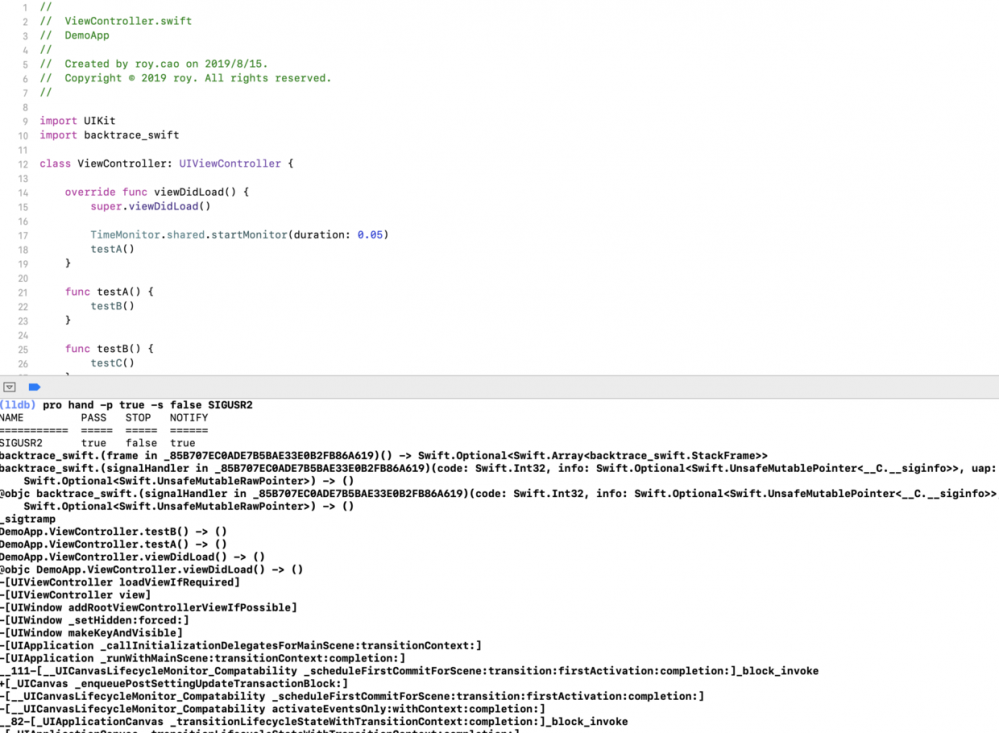 注意在Xcode的时候,因为Xcode屏蔽了signal的回调,我们需要在lldb中输入以下命令,signal的回调就可以进来了