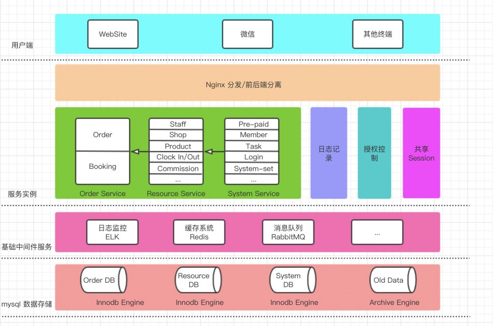 这里简单介绍一下,这里ELK或许并非最好的选择,可以另外采用zabbix或者prometheus,我只是考虑了后续可能的扩展。数据库采用了两种存储引擎,便是为了因对上面所说的每天十万单的大数据量,可以采用定时脚本的形式完成数据的转移。