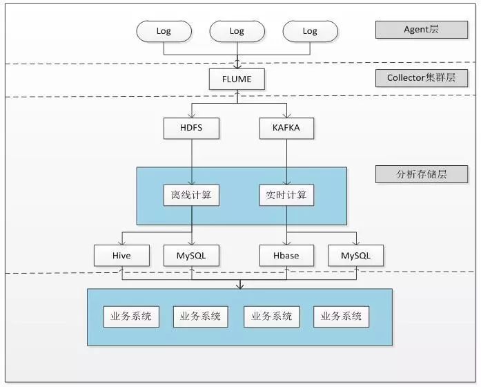 1、Agent层收集到各个系统的日志信息,通过Flume或者类似工具进行日志收集;