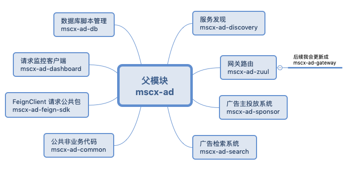 这个我命名的时候没有使用 ad-eureka ,在项目中也是尽量使用的 SpringCloud Common 抽象的公共注解,比如 @EnableDiscoveryClient ,其实有心的同学能看的出来,我打的主意也是想要后续替换的,我们可以使用ZK,但是我后期同样会使用我们阿里大大的 NACOS 来替换掉它。