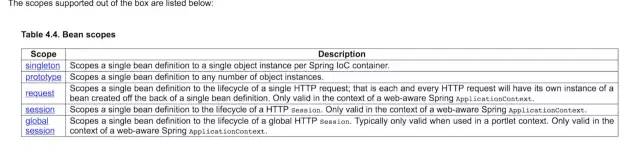 如下图是官方文档上的截图,感兴趣的朋友可以进去看看这五种分别有什么不同。今天要介绍的是这五种中的前两种,也是Spring最初提供的bean scope singleton 和 prototype。
