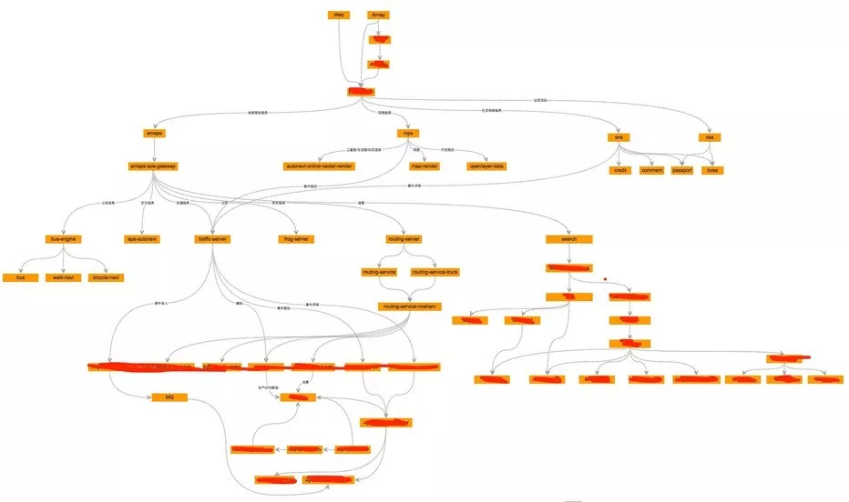 这张图是高德业务核心链路的架构,从图中可以看出高德业务具有相当高的复杂性。当然,真实系统远远要比图表示的复杂,如果用这张图来代表高德整体业务形态,无异于管中窥豹,太过于片面。