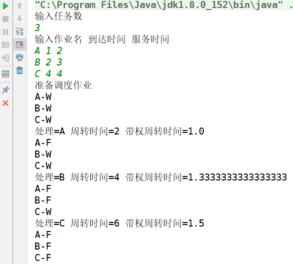 先输入一个数n,表示共有那个作业,在接下来的n行输入中,每行包含三个数据:作业名、到达时间、服务时间。输出中 W:等待状态,F:完成状态。