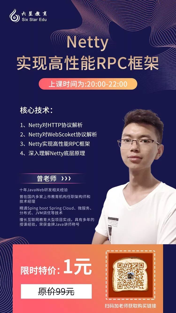 小编给大家 推荐 腾讯课堂联合六星教育 的一个 1块钱 课程 《Netty实现高性能RPC框架》 ,看它到底是怎么样来实现我们常说常说的诸如服务器框架、网络编程、对HTTP、WebScoket协议解析、实现高性能RPC框架的开发精髓。