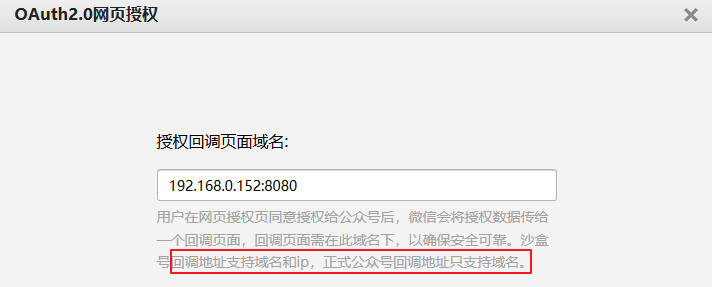 在微信公众号请求用户网页授权之前,需要先到公众平台官网中,修改授权回调域名,请注意,这里填写的是域名(是一个字符串),而不是URL,因此请勿加 http:// 等协议头