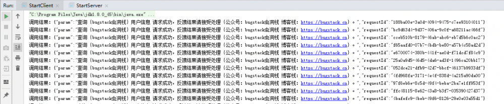 调用结果:{"param":"查询{bugstack虫洞栈}用户信息 请求成功,反馈结果请接受处理{公众号:bugstack虫洞栈 博客栈:https://bugstack.cn}。","requestId":"cceb510b-8179-46ab-abc6-eb7d5b6c0ac2"}