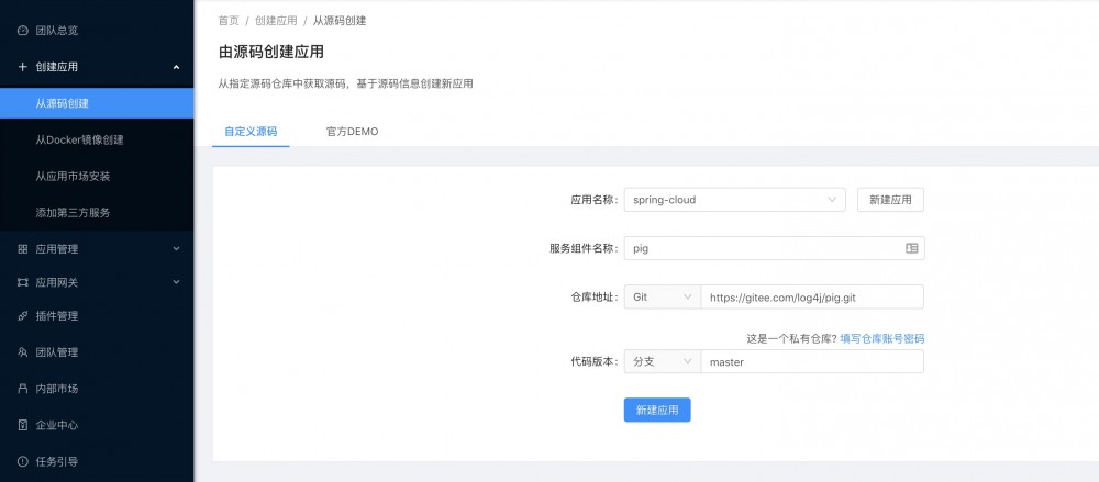 这里以 SPRING CLOUD 微服务部署在 RAINBOND 的案例 一文中的Pig项目中Java源码部署部分为例,一次性多模块部署Pig项目(其他依赖如Mysql默认安装好)。