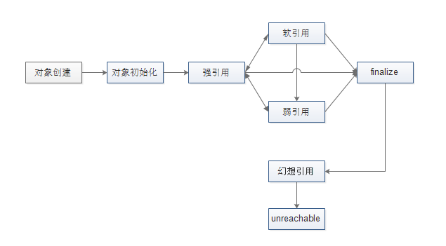 这四种应用主要的区别体现在对象不同的可达性状态和对垃圾收集的影响,他们之间的可达性状态可以参看下图: