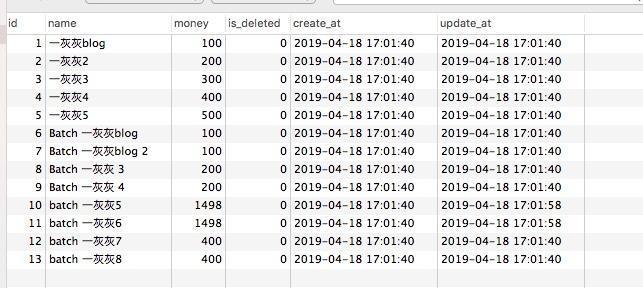 INSERT INTO `money` (`id`, `name`, `money`, `is_deleted`, `create_at`, `update_at`) VALUES (1, '一灰灰blog', 100, 0, '2019-04-18 17:01:40', '2019-04-18 17:01:40'), (2, '一灰灰2', 200, 0, '2019-04-18 17:01:40', '2019-04-18 17:01:40'), (3, '一灰灰3', 300, 0, '2019-04-18 17:01:40', '2019-04-18 17:01:40'), (4, '一灰灰4', 400, 0, '2019-04-18 17:01:40', '2019-04-18 17:01:40'), (5, '一灰灰5', 500, 0, '2019-04-18 17:01:40', '2019-04-18 17:01:40'), (6, 'Batch 一灰灰blog', 100, 0, '2019-04-18 17:01:40', '2019-04-18 17:01:40'), (7, 'Batch 一灰灰blog 2', 100, 0, '2019-04-18 17:01:40', '2019-04-18 17:01:40'), (8, 'Batch 一灰灰 3', 200, 0, '2019-04-18 17:01:40', '2019-04-18 17:01:40'), (9, 'Batch 一灰灰 4', 200, 0, '2019-04-18 17:01:40', '2019-04-18 17:01:40'), (10, 'batch 一灰灰5', 1498, 0, '2019-04-18 17:01:40', '2019-04-18 17:01:58'), (11, 'batch 一灰灰6', 1498, 0, '2019-04-18 17:01:40', '2019-04-18 17:01:58'), (12, 'batch 一灰灰7', 400, 0, '2019-04-18 17:01:40', '2019-04-18 17:01:40'), (13, 'batch 一灰灰8', 400, 0, '2019-04-18 17:01:40', '2019-04-18 17:01:40'); 复制代码