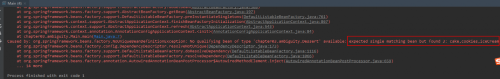 此时又带来了新的歧义性问题,因为Spring又不知道该如何选择了,运行代码会抛出 org.springframework.beans.factory.NoUniqueBeanDefinitionException 异常,如下所示: