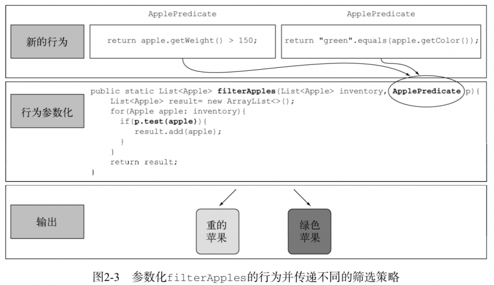 我们对苹果的所有属性进行更高一个层次的抽象建模,通过定义ApplePredicate 接口,AppleHeavyWeightPredicate 和 AppleGreenColorPredicate 分别实现该接口来达到进行不同的筛选功能。客户端调用中创建不同的实现类,对于filterApple() 方法而言,是传入了不同的行为,即行为参数化。行为参数化:让方法接受多种行为(或战略)作为参数,并在内部使用,来完成不同的行为。