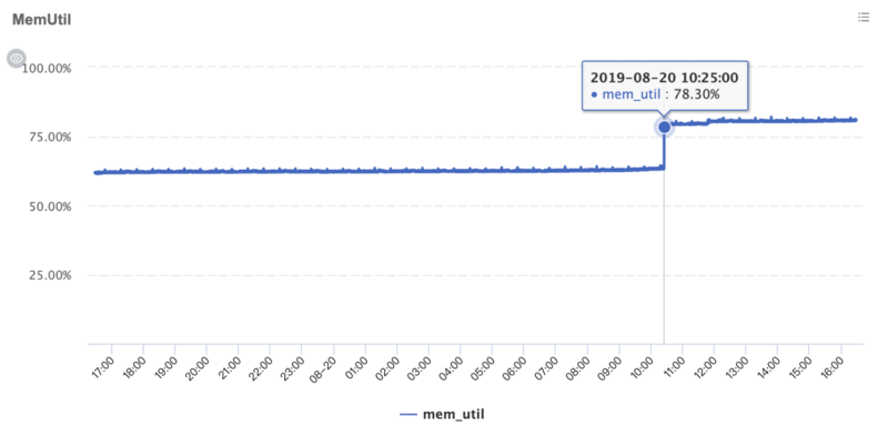 最近刚刚将自己的一个应用从CMS升级到G1,在一天早上,刚刚到办公室坐下,就收到手机一阵报警,去查看了监控,发现机器的内存出现了一个90度的涨幅,如下图所示: