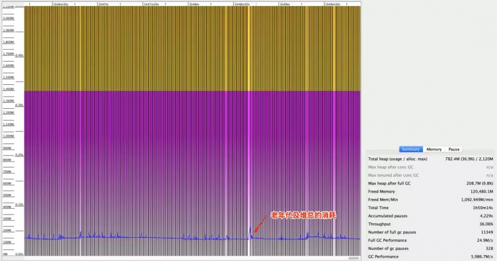 查看这个应用的监控指标数据,发现这个应用的 GC 开销明显提高, 是 GC 导致 JVM CPU 开销增加 。于是 SRE 查看了它的 verbose GC 日志,具体如图 1 所示: