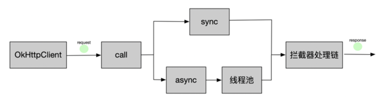 客户端OkHttpClient发起调用请求,首先创建一个RealCall对象,然后根据用户是选择同步还是异步方式来执行不同流程。如果是同步方式,则直接执行,如果是异步方式,则将请求放入线程池来执行,最后通过一个 拦截器链 来完成具体的请求过程并获取响应。这个拦截器链是整个OkHttp框架的核心,我会在后面详细地介绍,这里你可以就把它理解为一个执行具体请求的对象即可。用一个图来描述吧,下图就是请求流程的过程图: