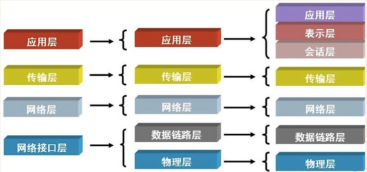 互联网协议按照功能不同分为osi七层和tcp/ip五层或tcp/ip四层,如下图: