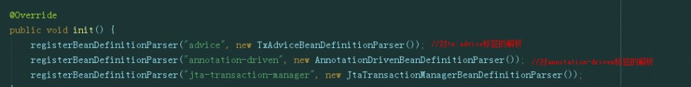下面我们开始分析Spring的相关源码,首先看一下对<tx:annotation-driven/>标签的解析,这里需要读者对Spring自定义标签解析的过程有一定的了解,笔者后续也会出相关的文章。锁定TxNamespaceHandler: