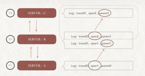 微服务A、B、C之间存在相互调用关系,我们为每次请求记录一条 log 。通过 log 中的 parnetID 来确定调用的层级关系,通过 spanID 来唯标识一个独立请求,通过 traceID 来收敛所有相关日志。最终就可以确定请求的调用层级结构。