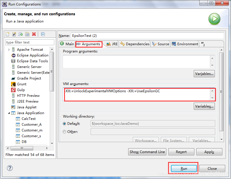 当程序执行到某一刻时,内存溢出,程序终止。现在我们来使用一下Epsilon,右键选择类文件,在Run As右侧选择Run Configurations: