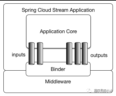 SpringCloudStream 应用模型下图所示。 Spring Cloud Stream由一个中间件中立的核组成。 应用通过Spring Cloud Stream插入的input和output通道与外界交流。 通道通过指定中间件的Binder实现与外部代理连接。 业务开发者不再关注具体消息中间件,只需关注Binder对应用程序提供的抽象概念来使用消息中间件实现业务即可。