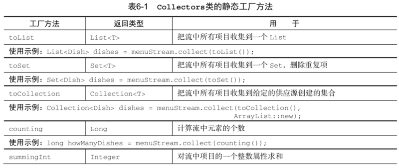 在需要将流项目重组成集合时,一般会使用收集器(Stream方法collect 的参数)。再宽泛一点来说,但凡要把流中所有的项目合并成一个结果时就可以用。这个结果可以是任何类型,可以复杂如代表一棵树的多级映射,或是简单如一个整数。