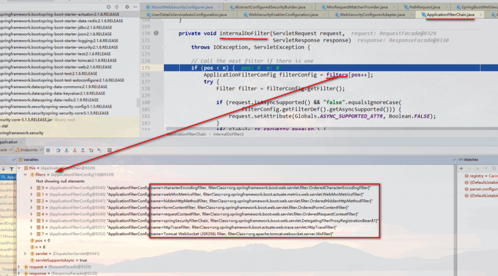 ,需要从这个过滤器链的集合中匹配出当前请求的那个过滤器链,有个关键:RequestMatcher(:point_down:),然后从将匹配到的securityFilterChain中的filter集合拿出来,便开始了进行了过滤,如下图所示