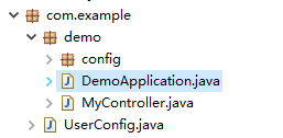 我讲的到底有没有道理呢?让我们来做个实验。 UserConfig 用于配置 User 对象,它位于 com.example 包下, DemoApplication.java 位于 com.example.demo 包下,此时 SpringBoot 是没法扫描到 UserConfig 并注入 User 对象的。