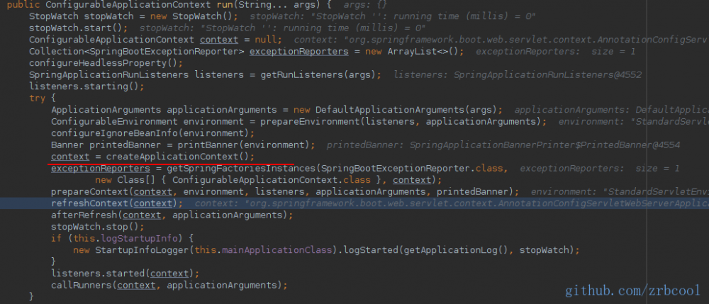 负责创建spring主容器,这个方法内部是根据具体项目运行时依赖的类来动态选择实现的,如果是web项目则会选择AnnotationConfigServletWebServerApplicationContext,至于选择的规则及原因,这里先忽略,后面会专门介绍(时空门:ServletWebServerApplicationContext)。