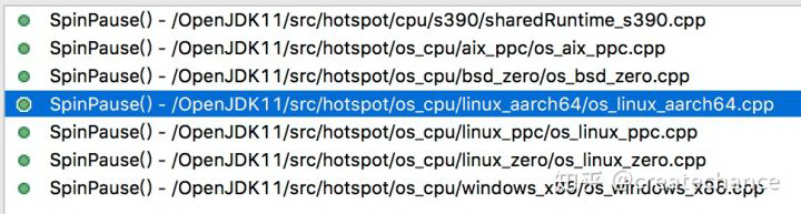 从函数的名称就能看出这是一个自旋锁的实现,并不会「立即」使得线程陷入等待状态,从实现上看,这里是通过一个死循环不断通过 cas 检查判断是否获得锁。这里开始会通过一个 cas 检查看下是否能够成功,如果成功的话就不用进行下面比较重量级的 spin 过程。如果获取失败,就需要进入下面的 spin 过程,这里的 spin 逻辑是一个比较有意思的算法。这里定义了一个 ctr 变量,其实就是 counter 计数器的意思,(ctr & 0xFFF) == 0 || !os::is_MP() 这个条件比较有意思,意思是说如果我尝试的次数大于 0xfff,或者当前系统是一个单核处理器系统,那么就执行下面的逻辑。可以看到这里的 spin 是有一定的限度的。首先开始的时候,如果是多核系统,会直接执行 SpinPause ,我们看下 SpinPause 函数的实现,这个函数是实现 CPU 的忙等待,因此会有不同系统和 CPU 架构的对应实现: