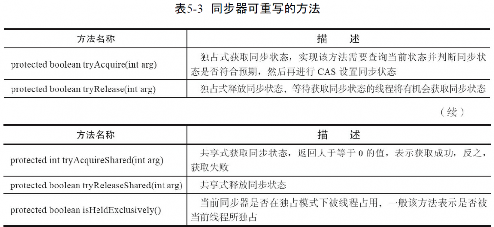 该方法增加了再次获取同步状态的处理逻辑:通过判断当前线程是否为获取锁的线程来决定获取操作是否成功,如果是获取锁的线程再次请求,则将同步状态值进行增加并返回true,表示获取同步状态成功。