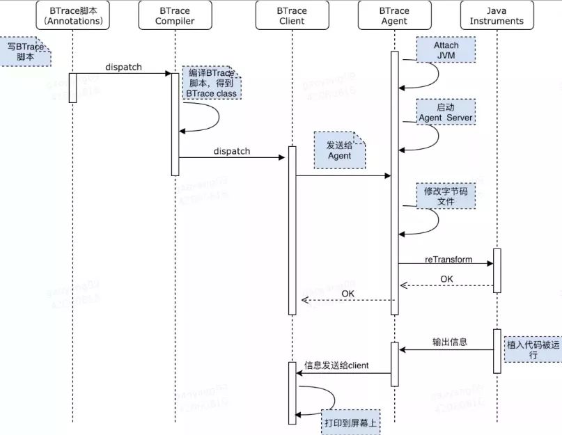 跟java源码一样,先编写 Btrace 脚本(也是java文件),编译( compiler ),通过client发送给 agent , agent 通过 attach api 添加到JVM并启动 agent server 来接收 client 发送过来的内容,然后底层是使用 ASM 修改字节码文件,之后使用 JavaInstrument 的 retransform 接口替换修改后的class文件,运行后的输出再通过 agent 发送到 client 进行显示。