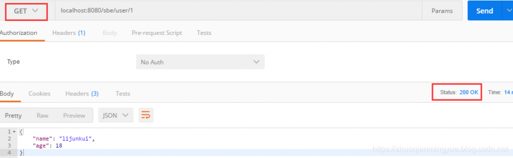根据用户id 查询用户:选择 GET 调用方式,然后在地址栏输入: localhost:8080/sbe/user/1 最后点击 Send。如下图所示成功返回用户信息和200 响应码。