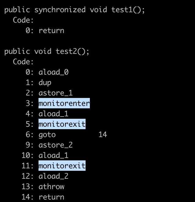 从上面可以看出,同步代码块是使用monitorenter和monitorexit指令实现的,同步方法(在这看不出来需要看JVM底层实现)依靠的是方法修饰符上的ACC_SYNCHRONIZED实现。