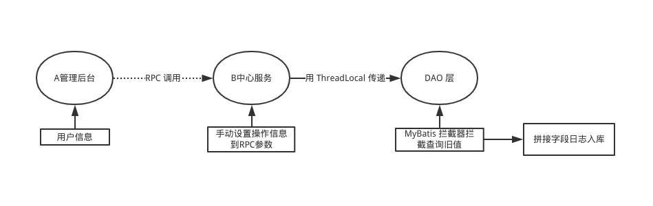 我需要在 RPC API 中加个字段来传递操作人的真实信息以及客户端 IP,B 服务接收到后通过 ThreadLocal 传递到 DAO 层,最后拦截器先去数据库查询出旧值,然后执行原来的方法,最后拼接旧值以及新值,日志入库。