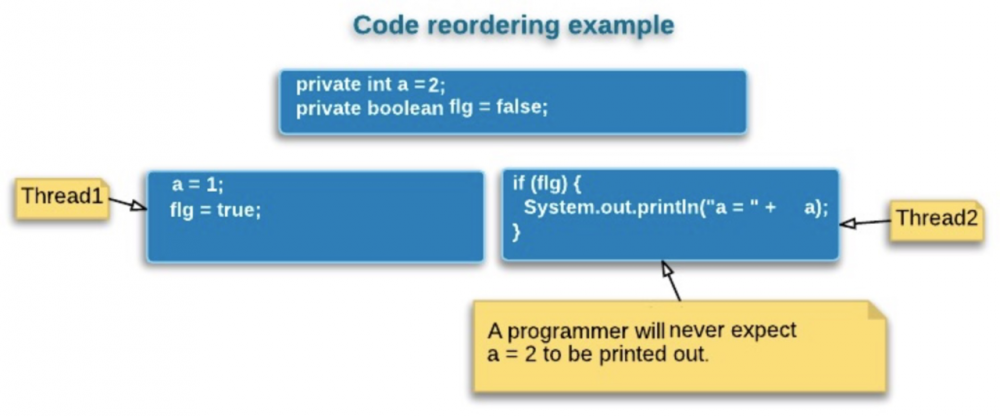 现代微处理器会通过指令乱序执行(out-of-order execution)来提升执行效率,除了处理器,Java自身的JIT编辑器也会对指令做重排序,最终生成的机器指令可能与字节码顺序并不一致。 在并发程序中,指令重排序可能会导致预期之外的执行结果,比如以下的程序,在多线程执行时,线程1中的语句可能会被乱序执行,flg=true可能会先于a=1被执行,则线程2可能会出乎意料地打印出 a = 2。