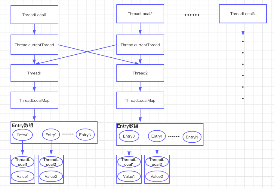 每一个 ThreadLocal 对象通过 Thread.currentThread 得到当前 Thread 对象,而 Thread 对象中引用了 ThreadLcoalMap 对象, ThreadLocalMap 对象又引用了 Entry 数组, Entry 数组中的每一个 Entry 对象是由 ThreadLocal 对象和变量值 Value 组成。遍历每一个 Entry 对象,比对其中的 ThreadLocal 对象是否和最上层传递进来的 ThreadLocal 对象相等,若相等,则返回其中的变量值 Value 。
