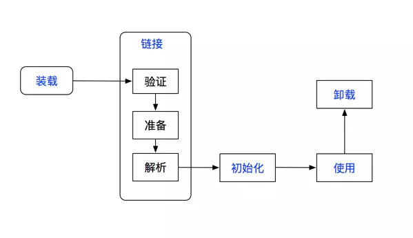 从类被加载进内存开始直到卸载出内存为止,类的生命周期包括 装载、验证、准备、解析、初始化、使用和卸载 7个过程,其中 验证、准备、解析 三个过程统称为链接。