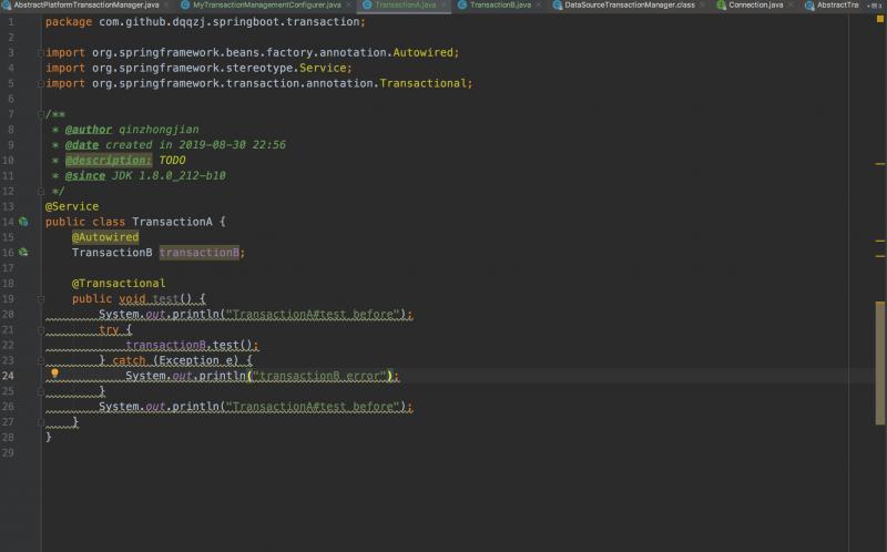有经验的同学肯定知道整个事务最终被回滚掉了, TransactionB#test 并没有执行 System.out.println("TransactionB#test after");