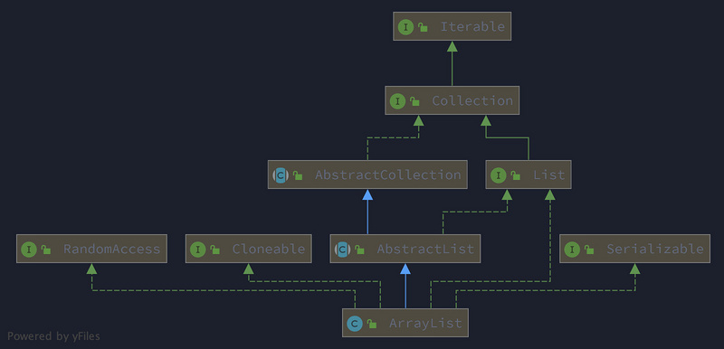 从上图可以看出 ArrayList 继承了 AbstractList, 直接实现了 Cloneable, Serializable,RandomAccess 类型标志接口。