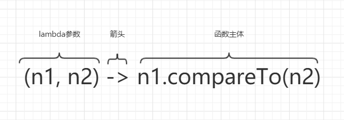 现在来看看 (n1, n2) -> n1.compareTo(n2)这个表达式,是不是发现了什么?没错,其实lambda表达式的参数列表就是对应的函数式接口的抽象方法的参数列表,并且类型可以省略(编译器自动推断),然后n1.compareTo(n2)的返回值是int类型,也符合compare()的方法描述。这样就算是把lambda表达式和接口的抽象方法签名匹配成功了,不会出现编译错误。