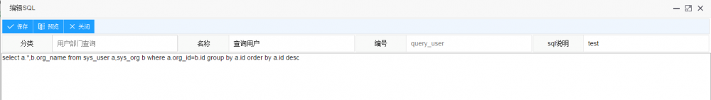 a、首先是在自定义sql定义好查询sql:如部门下拉数据sql,编号命名为query_org;查询用户,编号命名为query_user